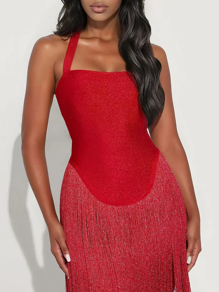 Vintage Sleeveless Halter Tassel Hem Dress Hot Girl Sleeveless Hollow Out Swing Dress Sexy Cocktail Party Backless Women's Dress