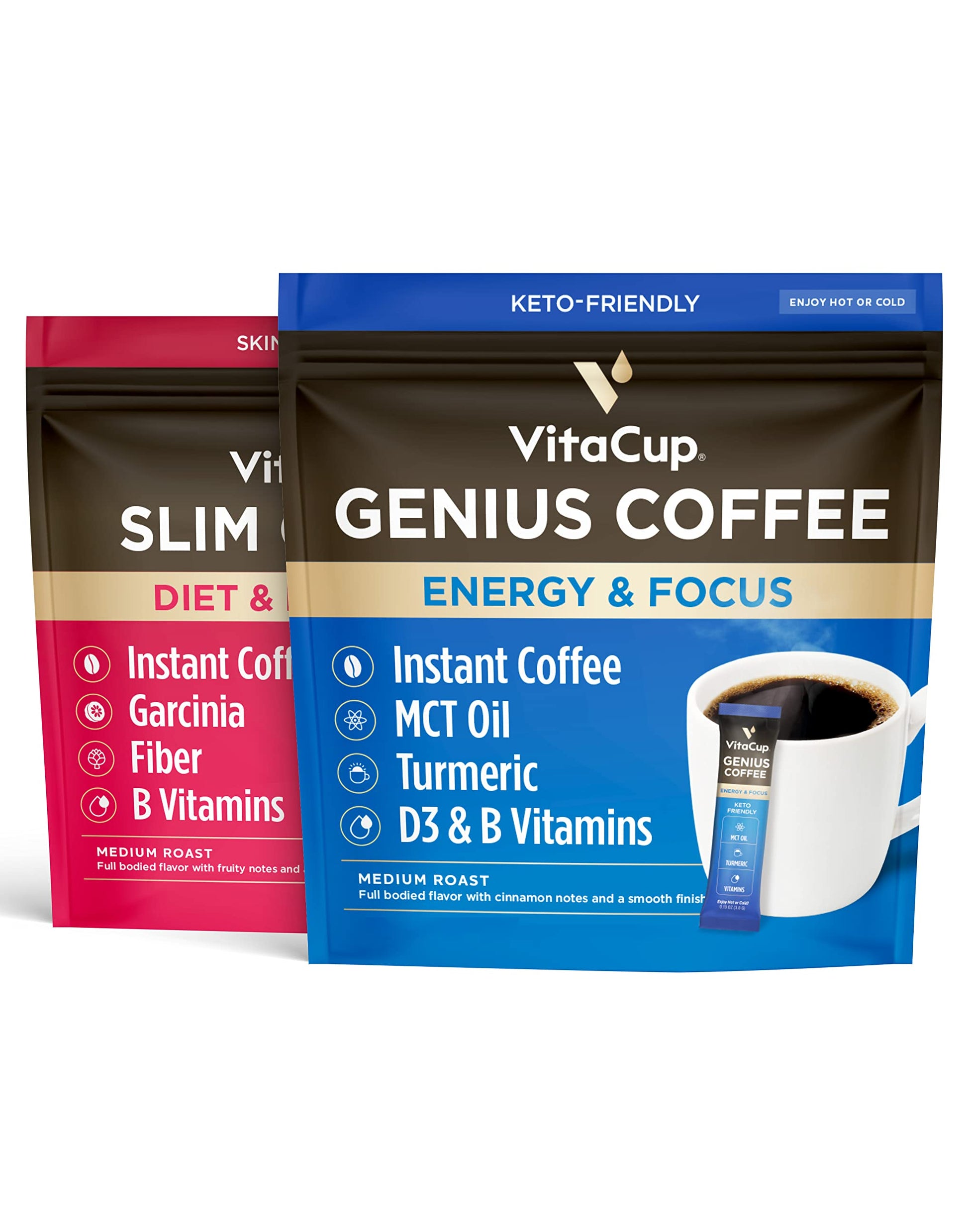 - VALUE BUNDLE: This Instant Coffee boosting bundle includes: (1) 24 count Genius Blend Instant Coffee & (1) 24 count Slim Blend Instant Coffee.