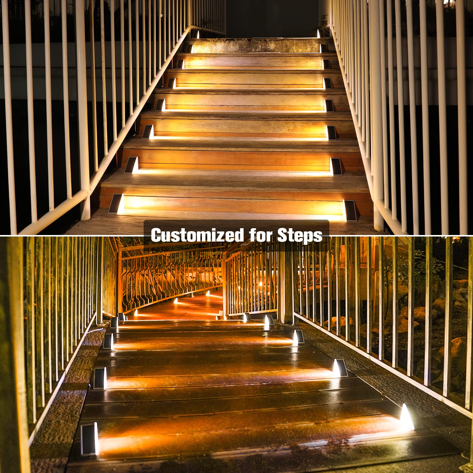 - 【Stylish and Functional】Solar step light can create a bright beam of light on each step, allowing every inch of the stairs to be clearly visible and reducing the risk of accidents or falls. Additionally, these step light outdoor can enhance the aesthetic appeal of the patio step, improving the overall appearance of outdoor steps. Don't settle for ordinary outdoor step lighting – upgrade to super lighting solar stair lights and enjoy the perfect combination of style and functionality.