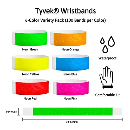 WristCo Tyvek Wristbands 6 Color Variety Pack - 600 Count - Comfortable Tear Resistant Paper Bracelets ID Wrist Bands for Concerts Festivals Admission Party Identification