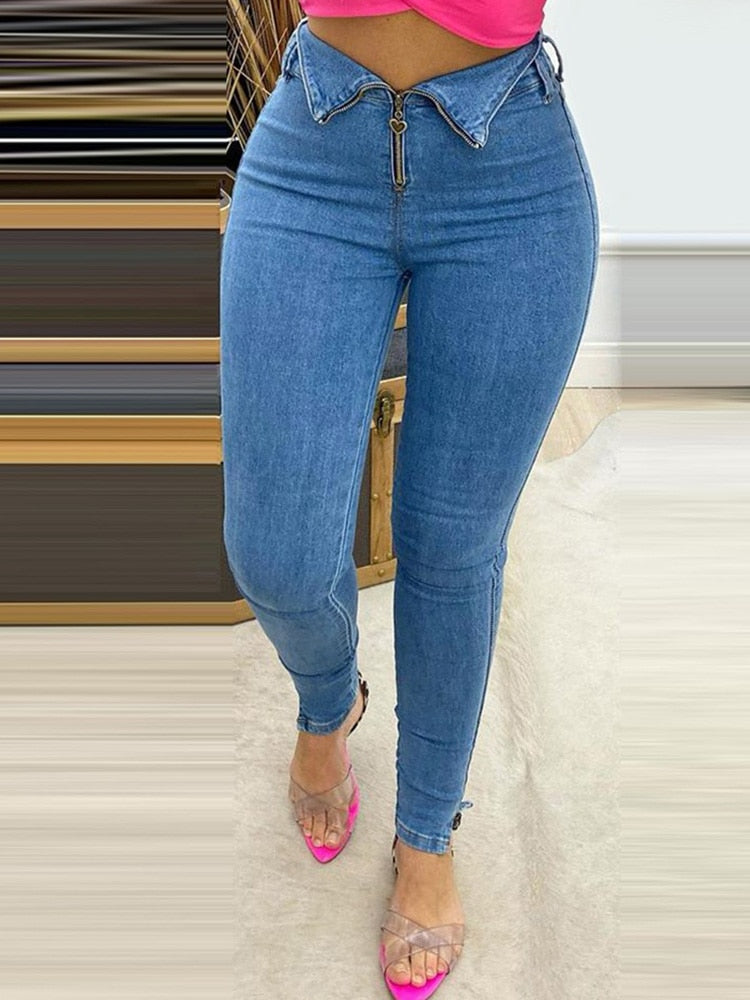 Zipper Design High Waist Skinny Jeans Women Casual Denim Pants